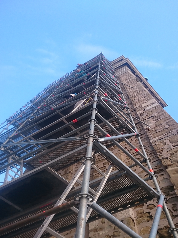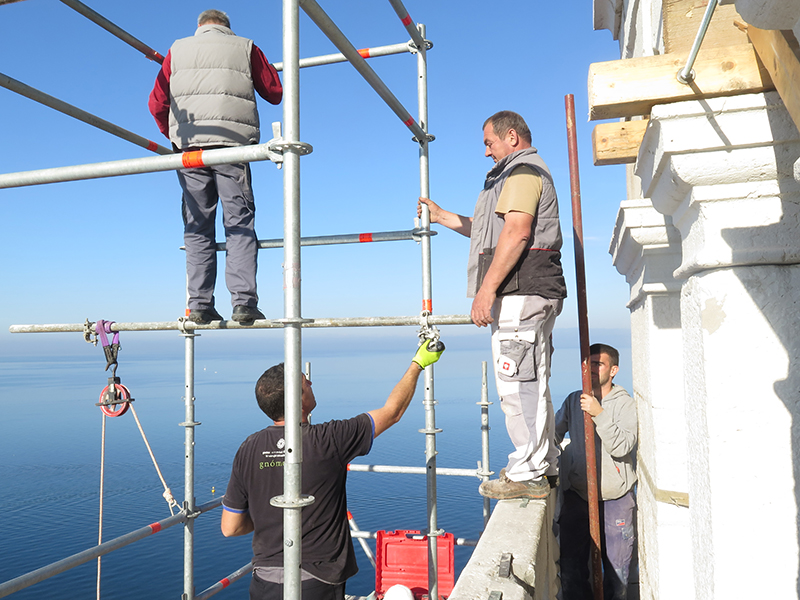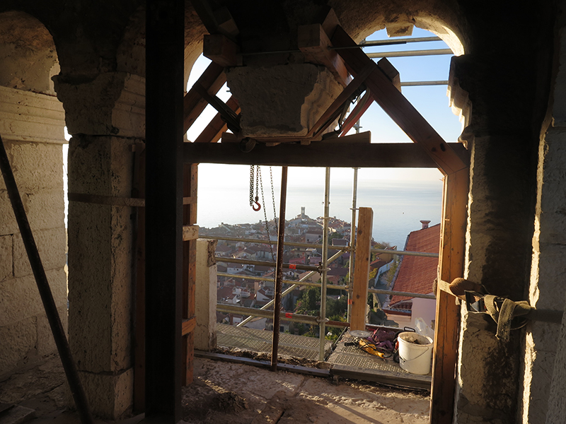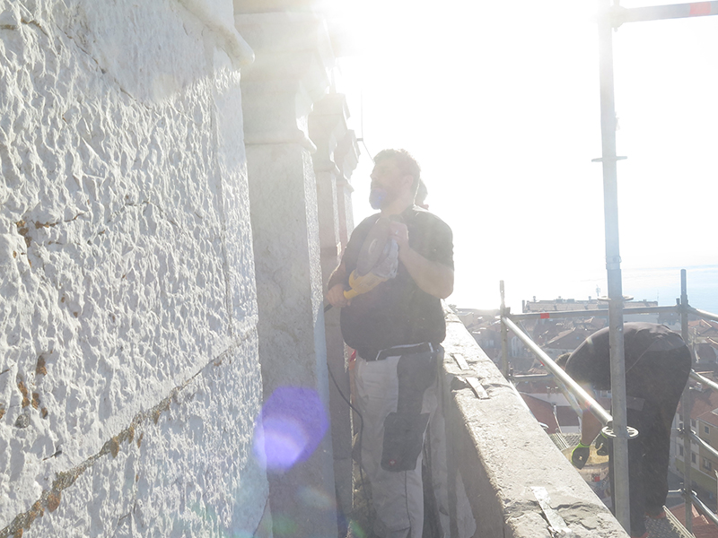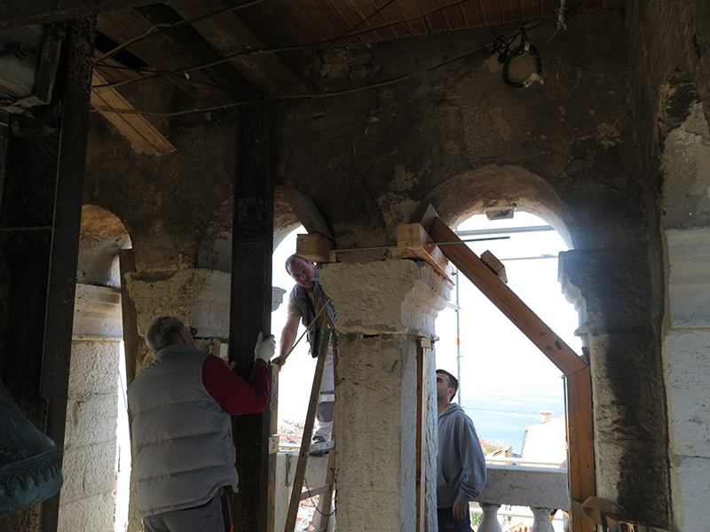 V ta namen je bil postavljen oder na zahodni strani zvonika, s pomočjo katerega je bilo možno varno odstranjevanje kamnitih elementov balustrade in podpornih stebrov med dvema poljema lin zvonika. Medtem se je na začasno odstranjenih kamnitih elementih opravilo konservatorsko restavrtatorski poseg, nato se jih je vrnilo na prvotna mesta.